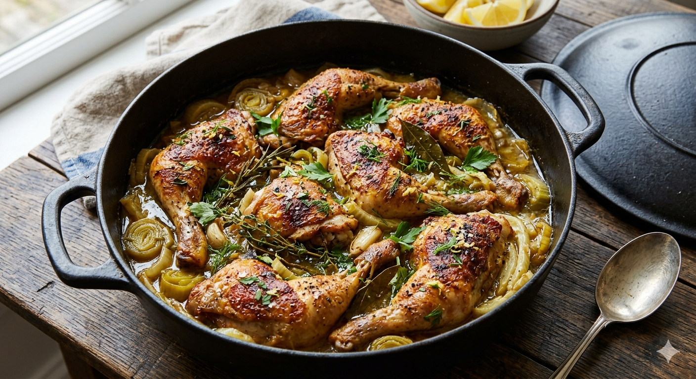 This recipe is all about balance. You get the rich, savory depth of golden-seared chicken paired with the mellow, buttery sweetness of caramelized leeks and fennel. A splash of white wine and a hint of Dijon mustard sharpen the sauce, while fresh-plucked rosemary, thyme, and a bright pop of lemon zest bring the whole dish to life.