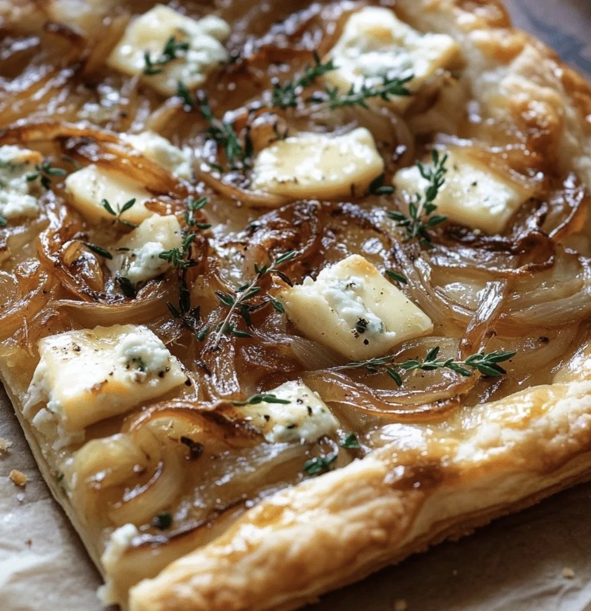 Elevate your next gathering with the rich, sophisticated flavors of our Rustic Thyme-Kissed Onion & Goat Cheese Tart.