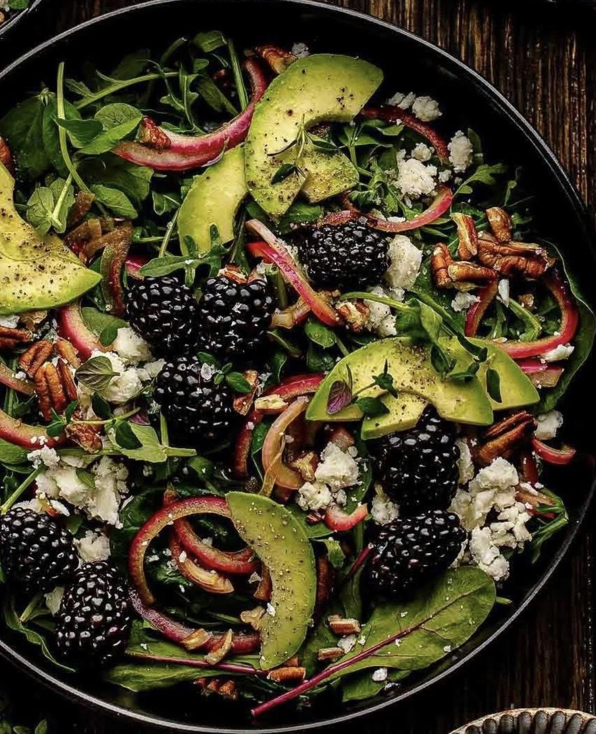 This isn't just a salad; it’s a masterclass in contrast. Velvety avocado slices meet the bold, tart pop of sun-ripened blackberries, all nestled in a bed of crisp, nutrient-dense greens. Topped with creamy feta and toasted pecans, it’s a sophisticated balance of earthy, sweet, and savory notes designed to elevate your table.