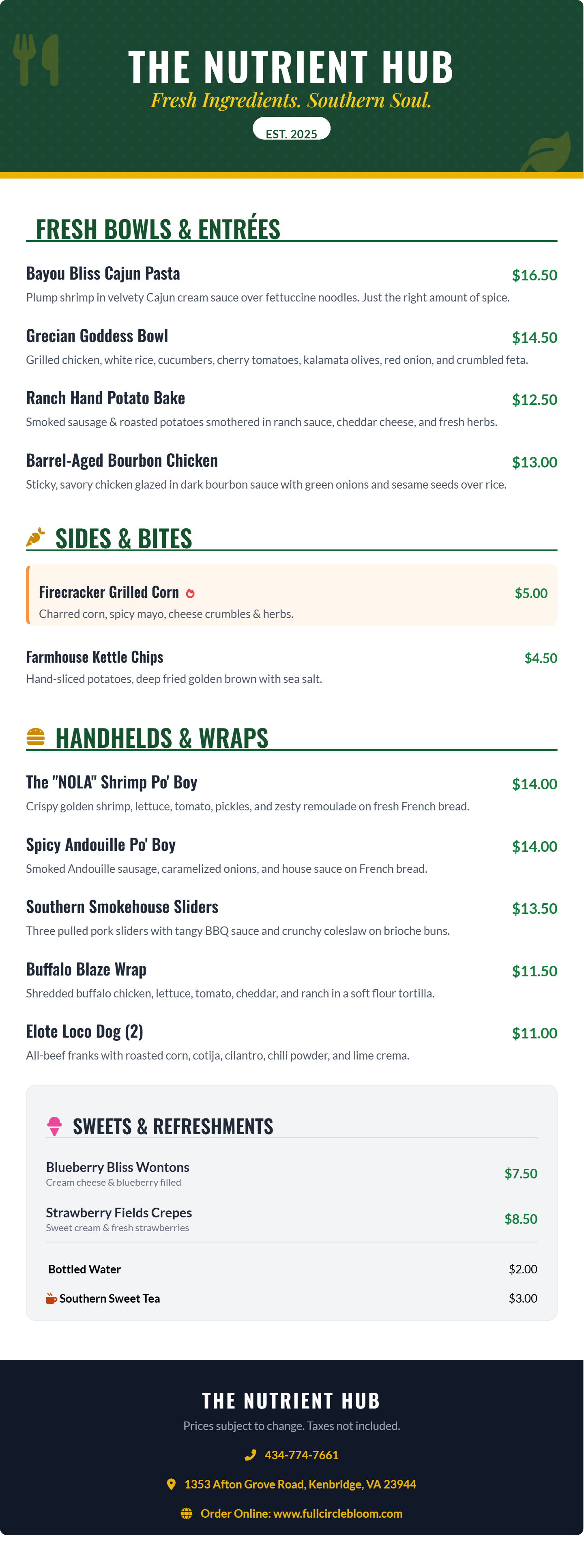 We are a high-quality, virtual restaurant in Kenbridge, VA dedicated to bringing you perfectly balanced, fresh, and flavorful meals designed to maximize your energy and minimize your effort.